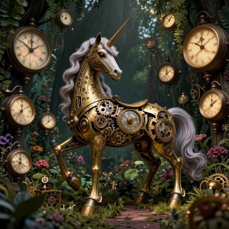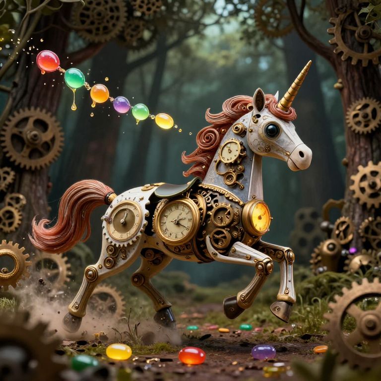 A clockwork unicorn gallops through a forest of tangled gears, spraying oil that crystallizes into glowing jellybeans as it passes.