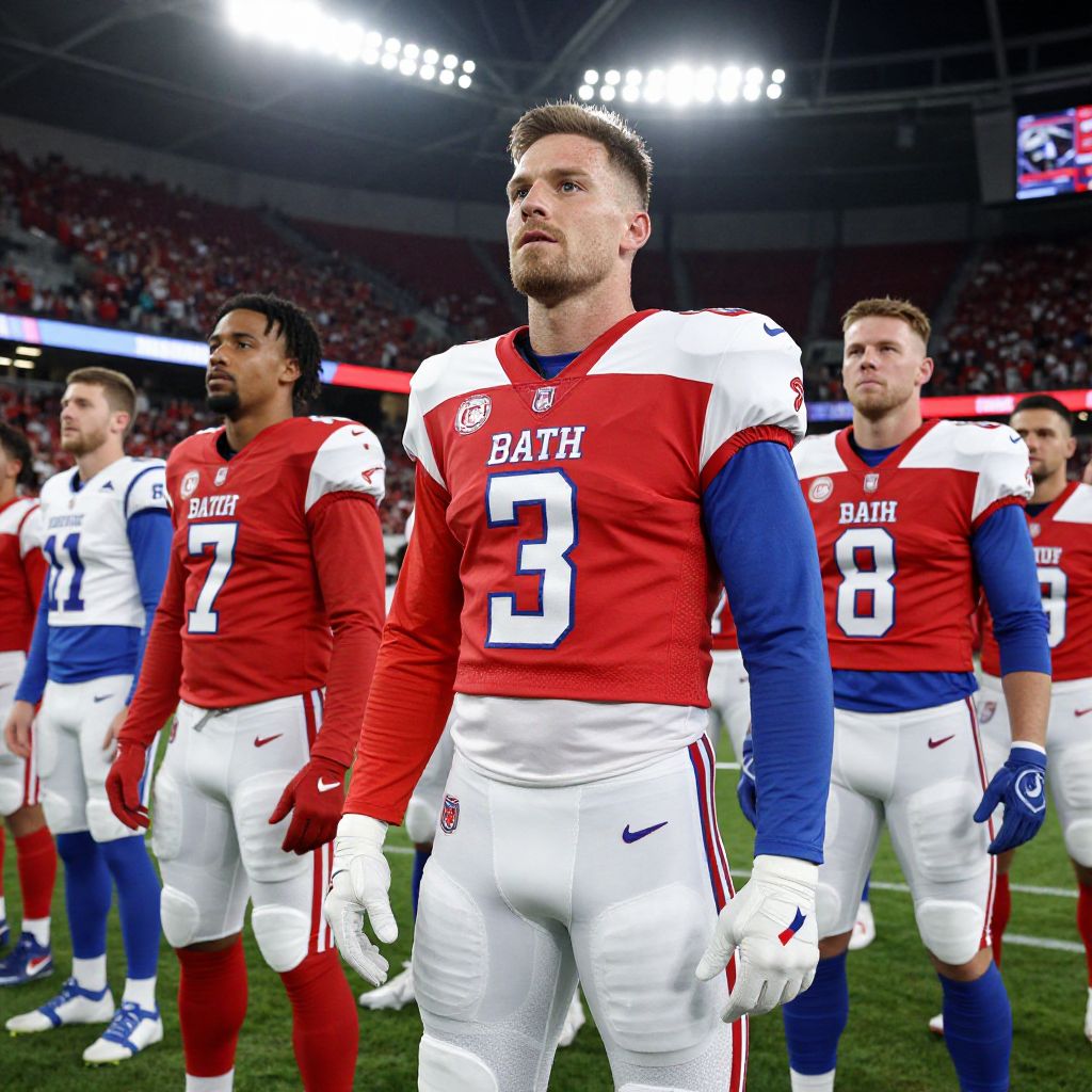 A group of professional football players wearing customized football player dress costumes during a pre-game halftime celebration in a stadium arena, with bright red, white, and blue team colors, realistic facial expressions, and detailed uniforms featuring names and numbers on the chest and sleeves, under stadium lights and cheering crowd background.
