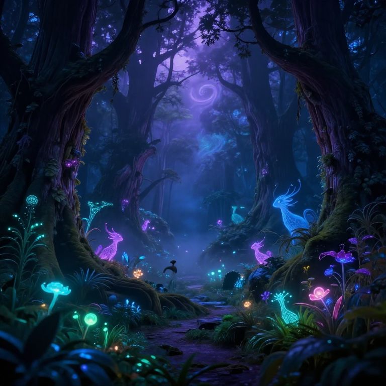 Stable diffusion art generator illustrating a mystical forest filled with bioluminescent plants and magical creatures, soft glowing lights and mist swirling through ancient trees, rich color palette with purples, blues, and greens, enchanting mood.
