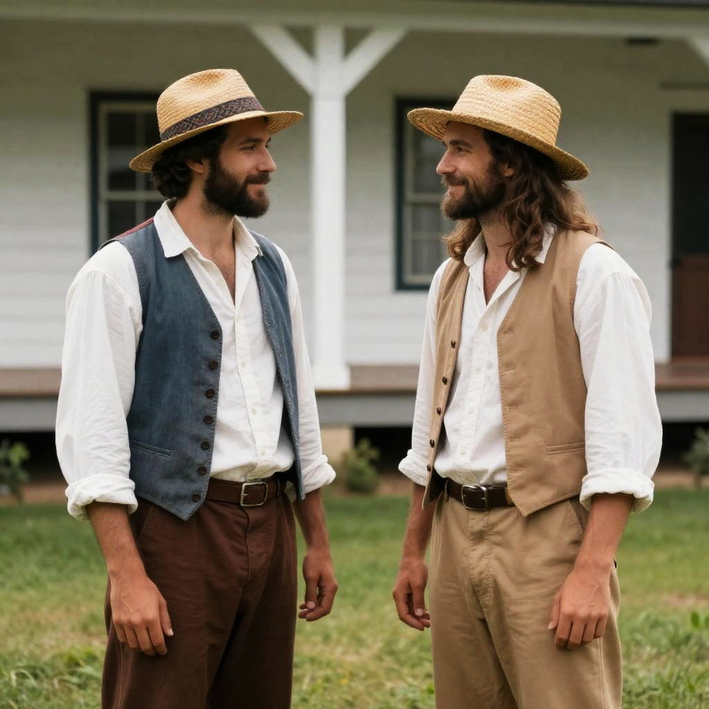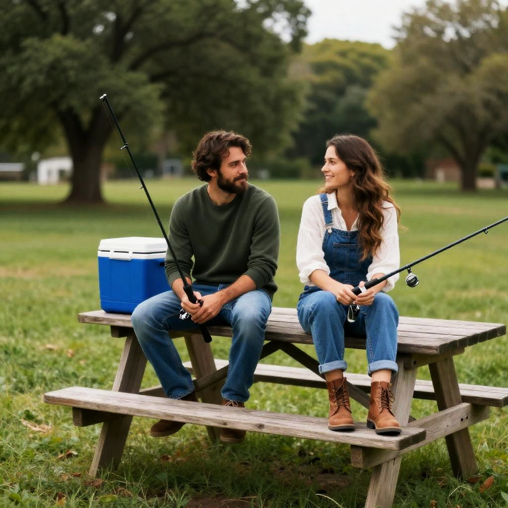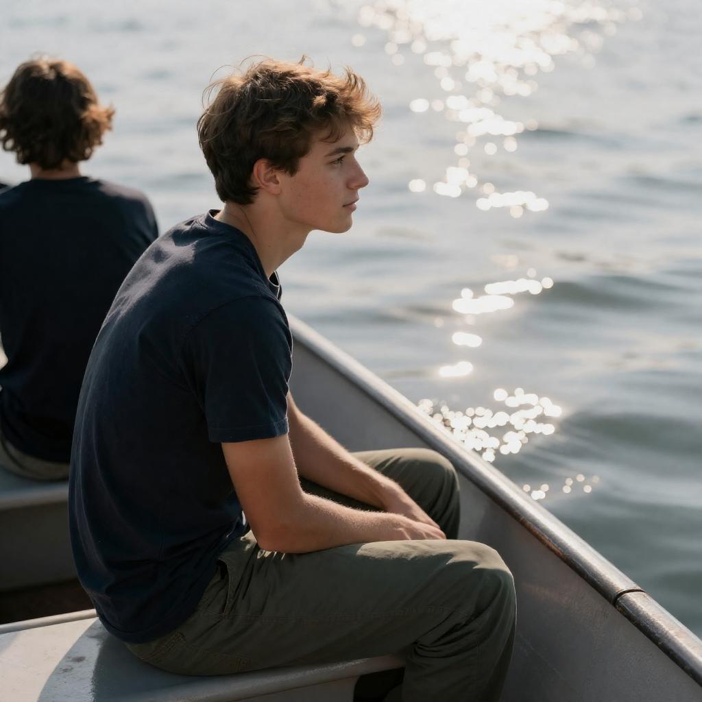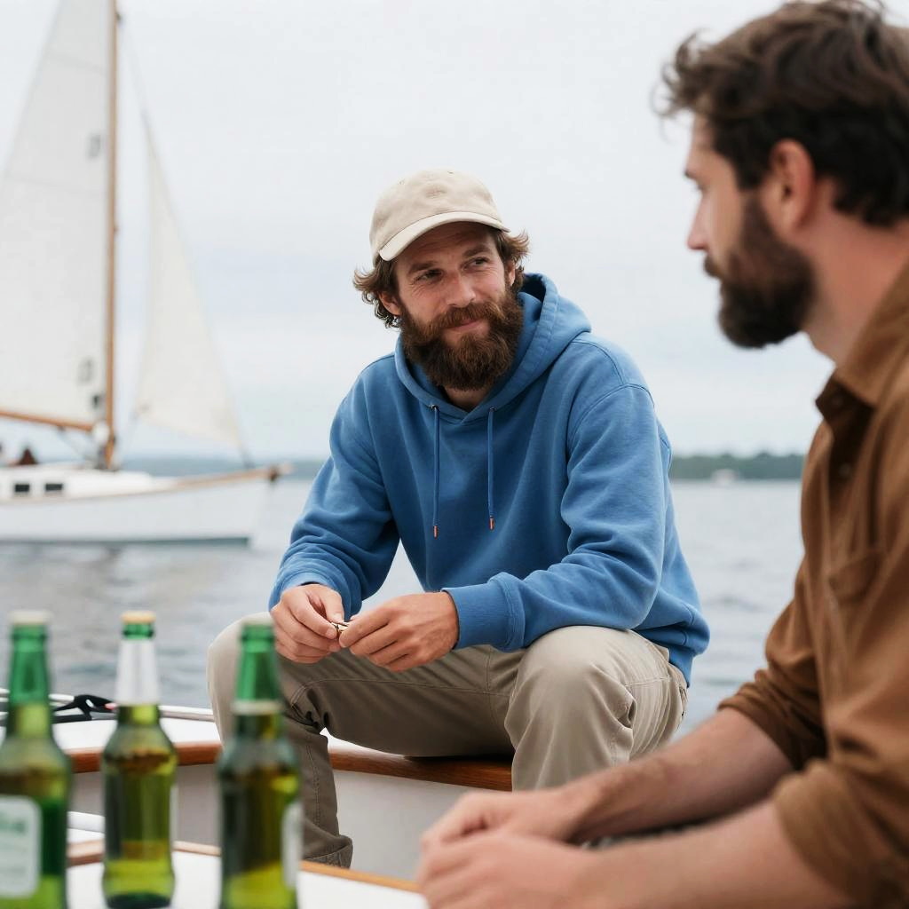 Two bearded men sitting and talking on a boat. The man in the center is wearing a blue hoodie, beige cap, and light brown pants, holding a small object and smiling slightly. The man on the right is in a brown shirt, shown in profile. Green beer bottles are visible in the foreground with a sailing boat in the background under an overcast sky.