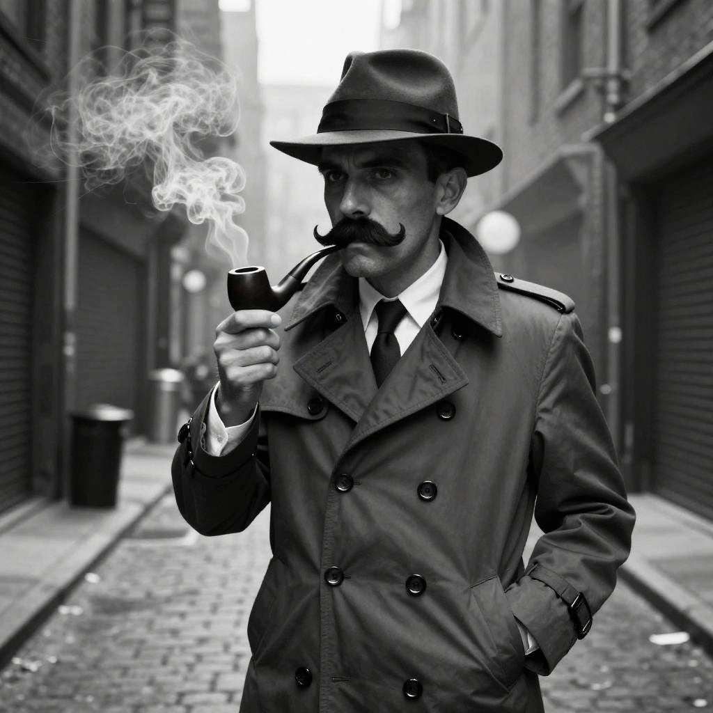 Rectangle mustache on a cartoon detective character, wearing a trench coat and fedora hat, smoking a pipe in a foggy, noir urban alleyway, with black and white shading and sharp contrasts emphasizing the mustache style.
