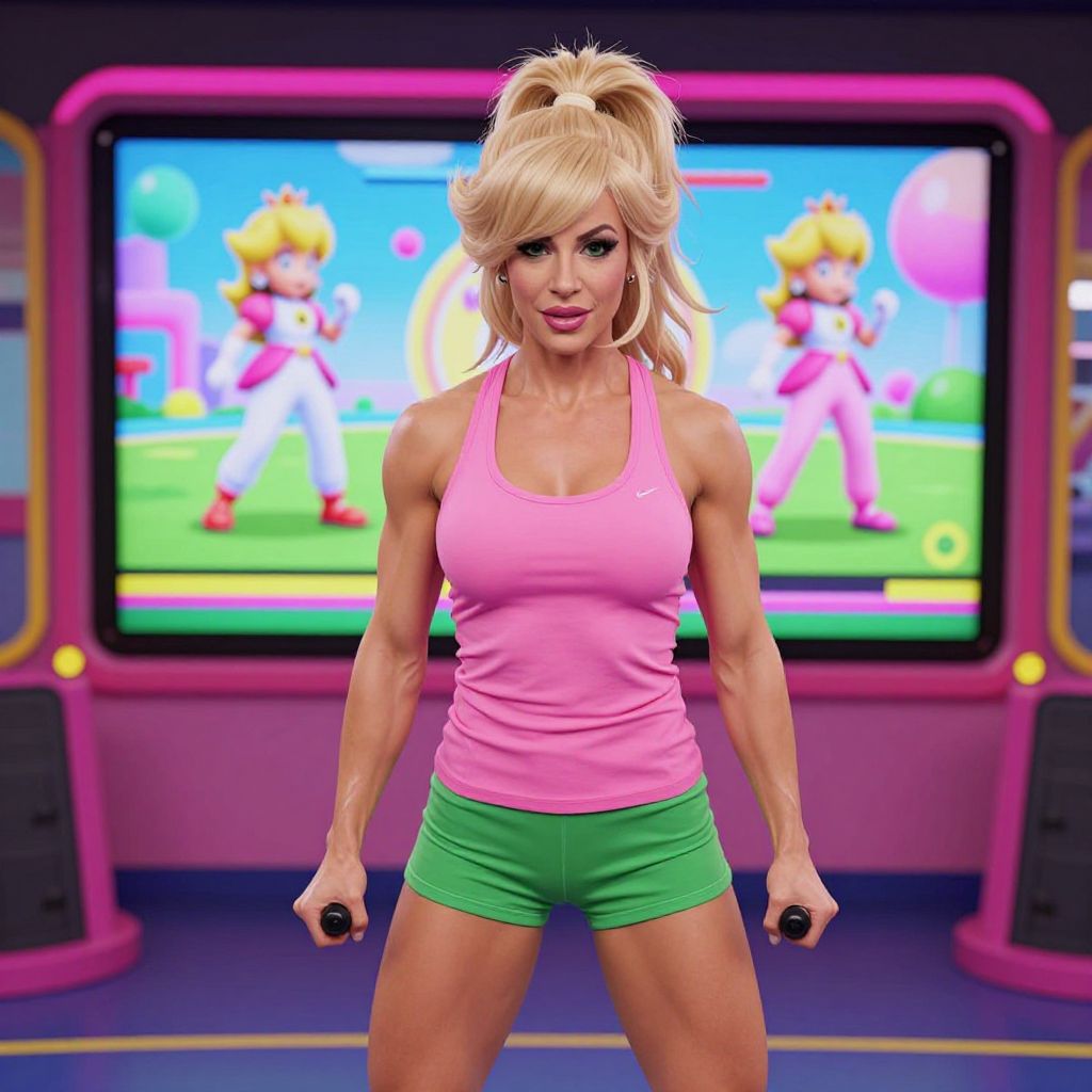In this vibrant and dynamic scene, a muscular woman with voluminous blonde hair styled in a high ponytail stands confidently in a gym setting. She is dressed in a pink tank top and green shorts, exuding strength and determination. Her hands grip a piece of exercise equipment, suggesting she is in the midst of a workout. The background features two large, colorful screens displaying an animated character, likely Princess Peach from the Nintendo universe, engaging in an aerobic exercise routine. The screens are flanked by pink and yellow equipment, adding to the retro, VHS aesthetic of the scene. The overall composition is lively and energetic, capturing the essence of a high-energy workout session.