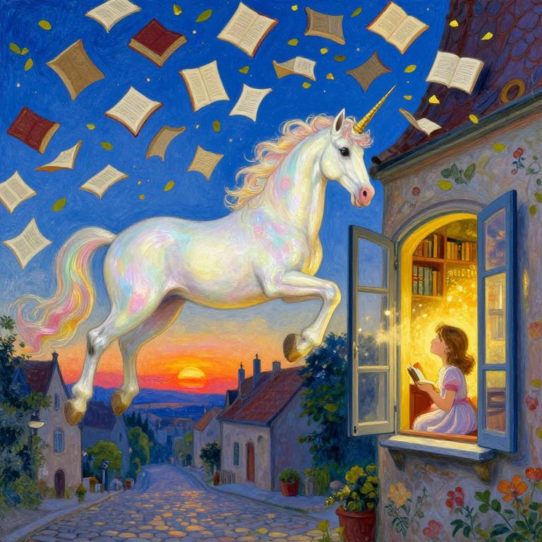 This vibrant digital painting depicts a fantastical scene at sunset. A glowing, white unicorn with a rainbow mane and tail leaps in mid-air towards an open window. Inside, a woman with brown hair and a pink dress reads a book, illuminated by warm light. Pages float around them in the sky. The background features a cobblestone street lined with quaint, colorful houses. The sky transitions from deep blue to orange, enhancing the magical atmosphere. The window frame is adorned with floral patterns, adding to the whimsical charm.