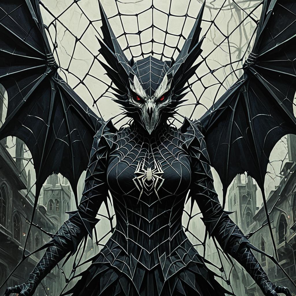 A close-up gothic painting of a vengeful harpy entwined in a spider web, featuring dark, intricate textures and hyper-detailed brushwork. The harpy has black spiked wings, a bird-like skull mask with glowing red eyes, and a body covered in a black spiderweb-patterned suit with a prominent white spider emblem on the chest. The eerie background includes gothic architecture in muted tones, enhancing the haunting atmosphere.