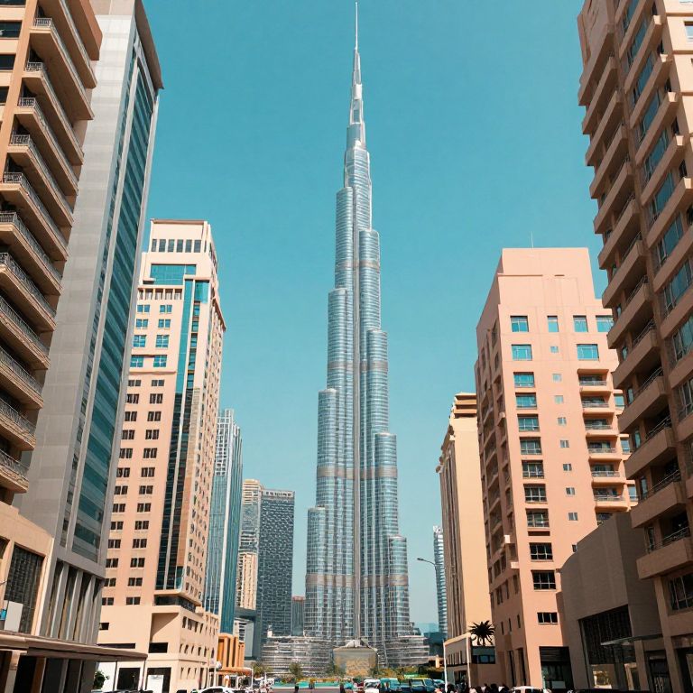 Vibrant streetscape unfolds beneath towering skyscrapers, where colorful facades of pastel-hued buildings line a bustling urban avenue, leading the eye toward the iconic Burj Khalifa piercing the azure sky above.