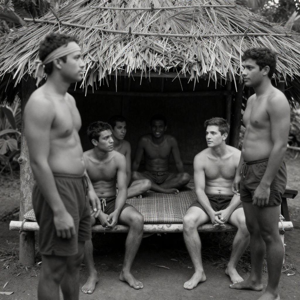Black-and-white photograph of three people on a small wooden boat in a lake. Two shirtless men, one with short hair and the other with long hair, stand on the right, while a woman with short hair leans over the side, washing clothes. The boat is centered, with a forested shoreline in the background.