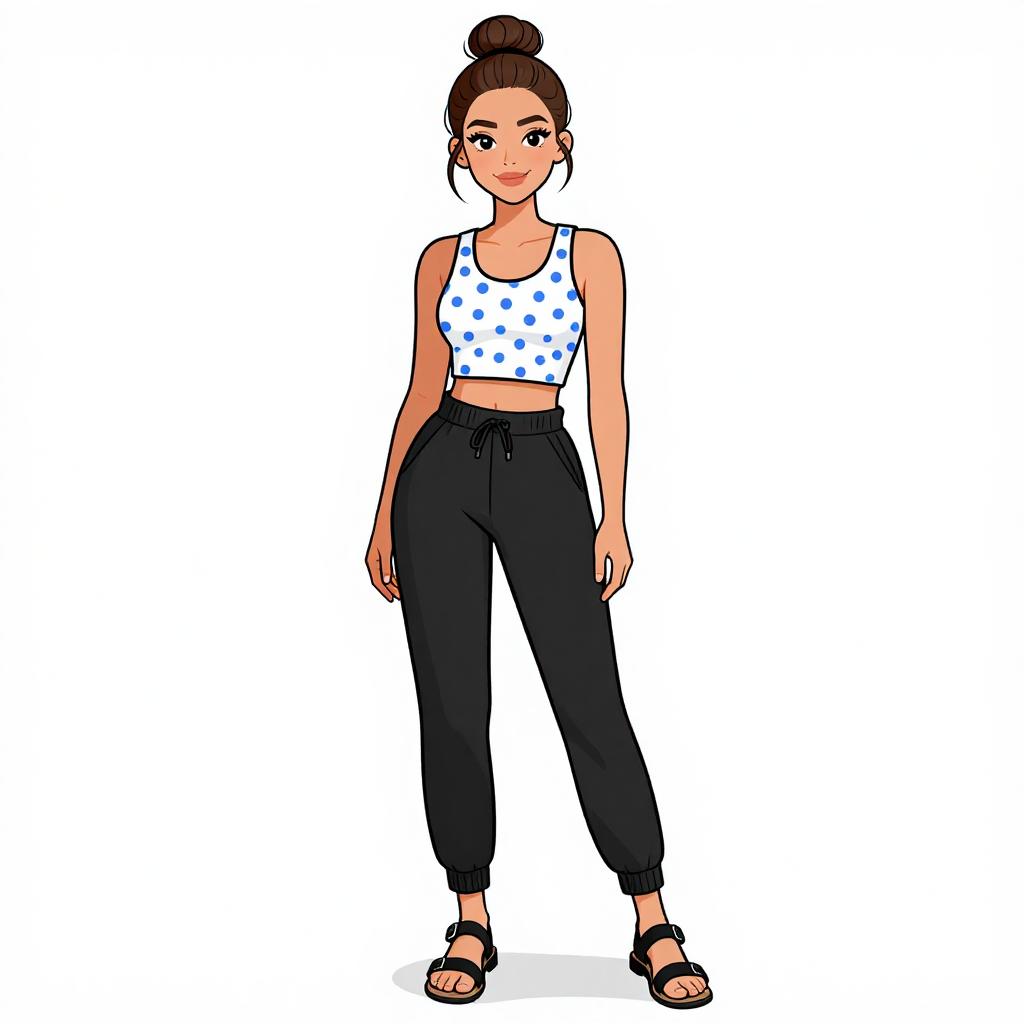 Digital cartoon of a smiling young woman with brown hair, wearing a black tank top, green cargo pants, and white sneakers, standing confidently against a white