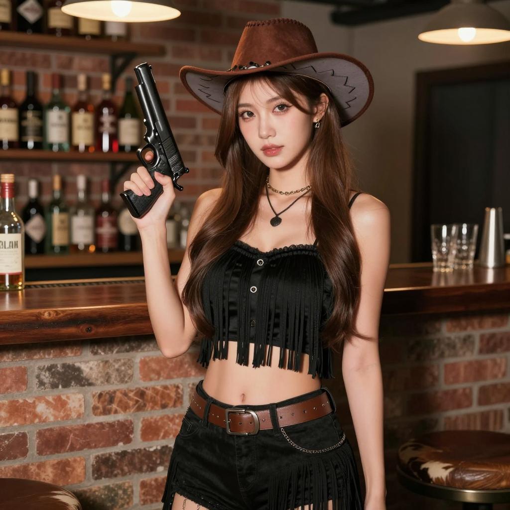 Young woman in military-style green dress with gold trim, black corset, black knee-high socks, and black shoes, standing in a dark doorway. She has light brown hair with bangs, a beret, and holds a black handgun in her right hand. Her left hand rests on the door frame. Her facial expression is neutral. A warning sign is on the wall to her left. The wall is grey and ured. She is the only person in the image. The image is a photograph.