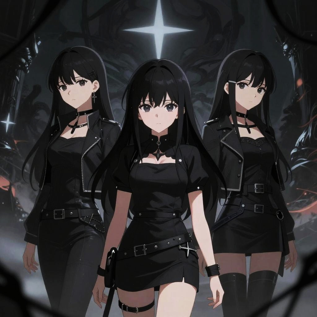 Anime girls black theme, showcasing characters with sleek black clothing and accessories, mysterious expressions, surrounded by dark fantasy elements like shadows and mist, illuminated by faint glowing symbols, ultra detailed anime style.