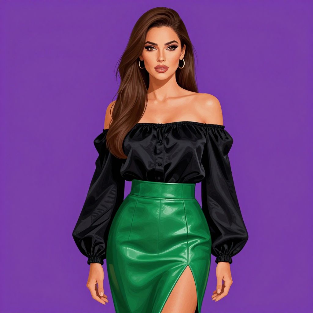 Digital illustration of a woman with long, wavy brown hair against a solid purple background. She has fair skin, full lips with pink lipstick, and blue eyes. She wears an off-the-shoulder, black, long-sleeved blouse with a slight sheen, paired with a high-waisted, green, leather pencil skirt that has a high slit on the left. She accessorizes with large, silver hoop earrings. The blouse's fabric appears slightly puffed at the sleeves, and the skirt has a smooth, glossy texture. The overall style is modern and chic, with a focus on contrasting colors and textures.