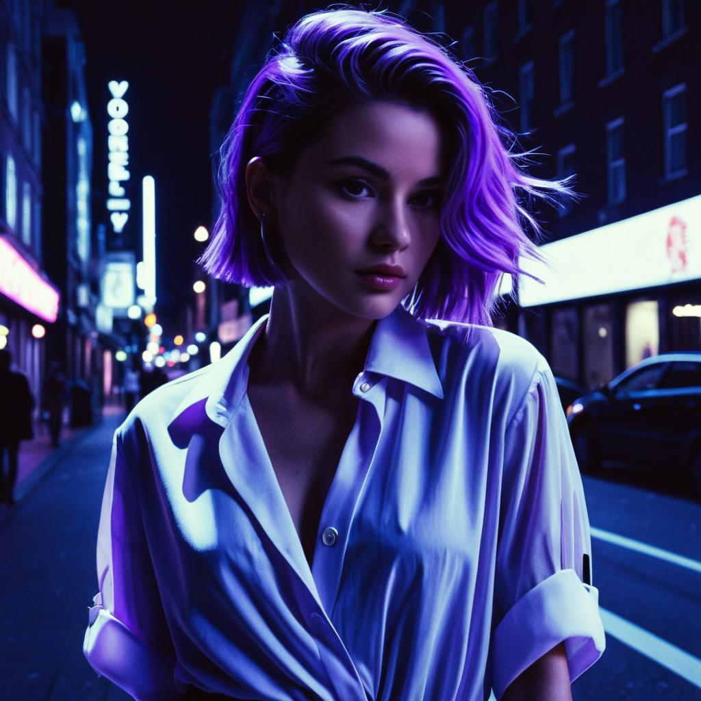 Lavender hairstyle on fashion model, wearing elegant blouse, in urban city street, captured in fashion editorial style with harsh neon light.