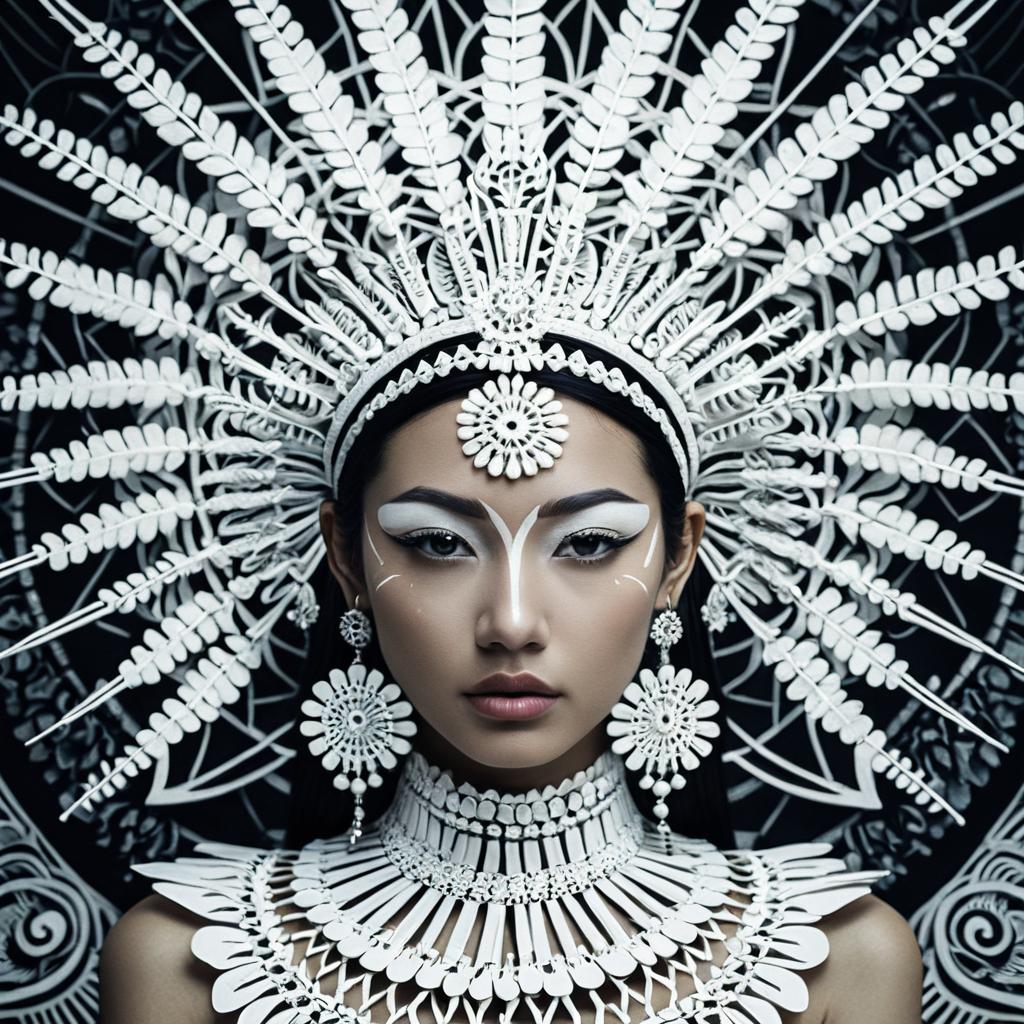 Absurdly beautiful, fashionable young thai woman with symmetrical white makeup, wearing an intricate headdress made from white bones, wearing large earrings made from white bones, ambient background in the fourth dimension, psychedellic fractals, ayahausca, tryptamine, hyperdetailed illustration by irakli nadar and alexandre ferra, intricate linework, unreal engine 5 highly rendered, global illumination, radiant light, detailed and intricate environment