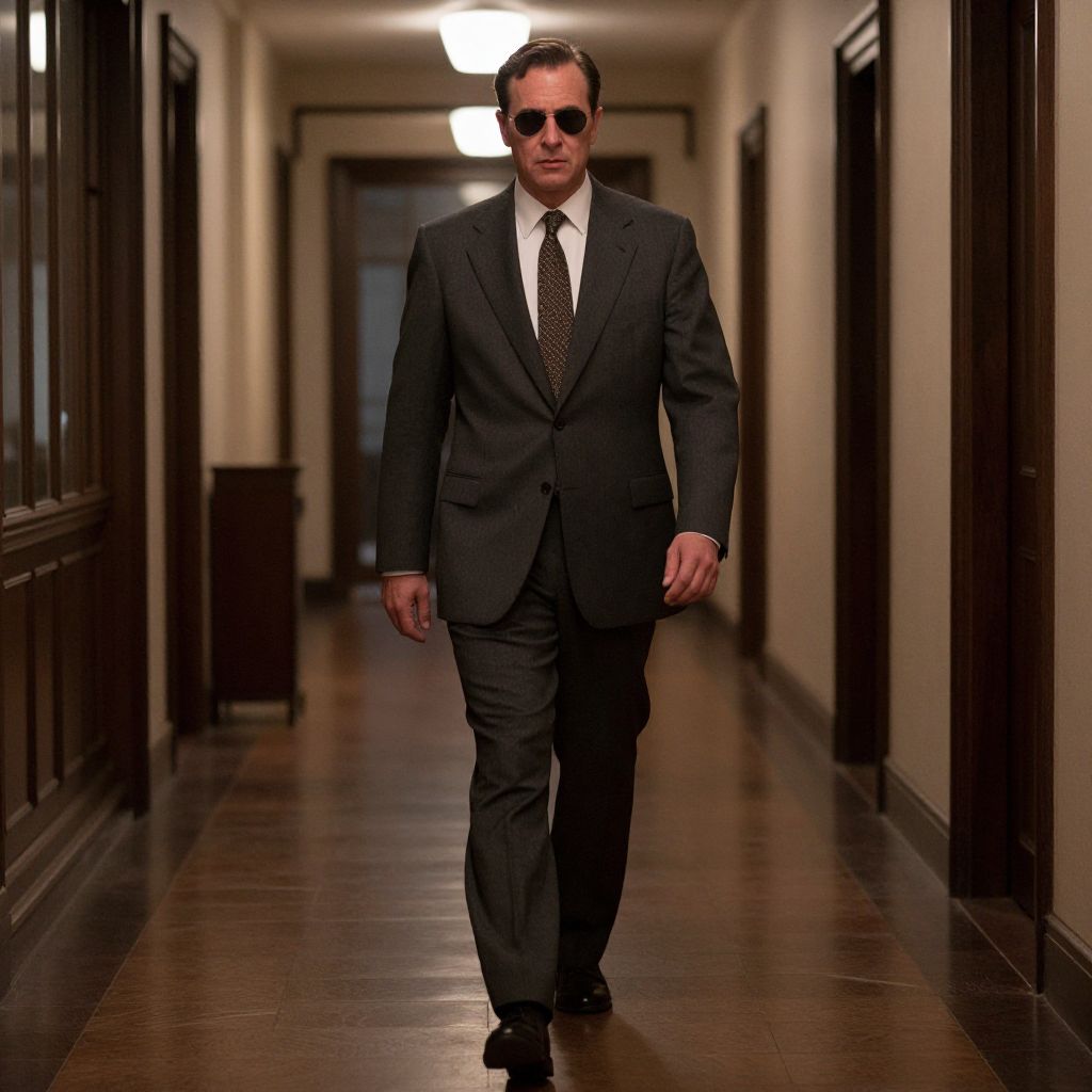 Photograph of a man walking down a dimly lit, narrow hallway with polished wooden floors and dark wooden wainscoting. He wears a black suit with a white dress shirt and a dark tie, and has short dark hair and sunglasses. The hallway has cream-colored walls and is illuminated by a single bright overhead light at the end. The man's expression is serious, and he walks confidently towards the camera. The overall atmosphere is formal and slightly mysterious.