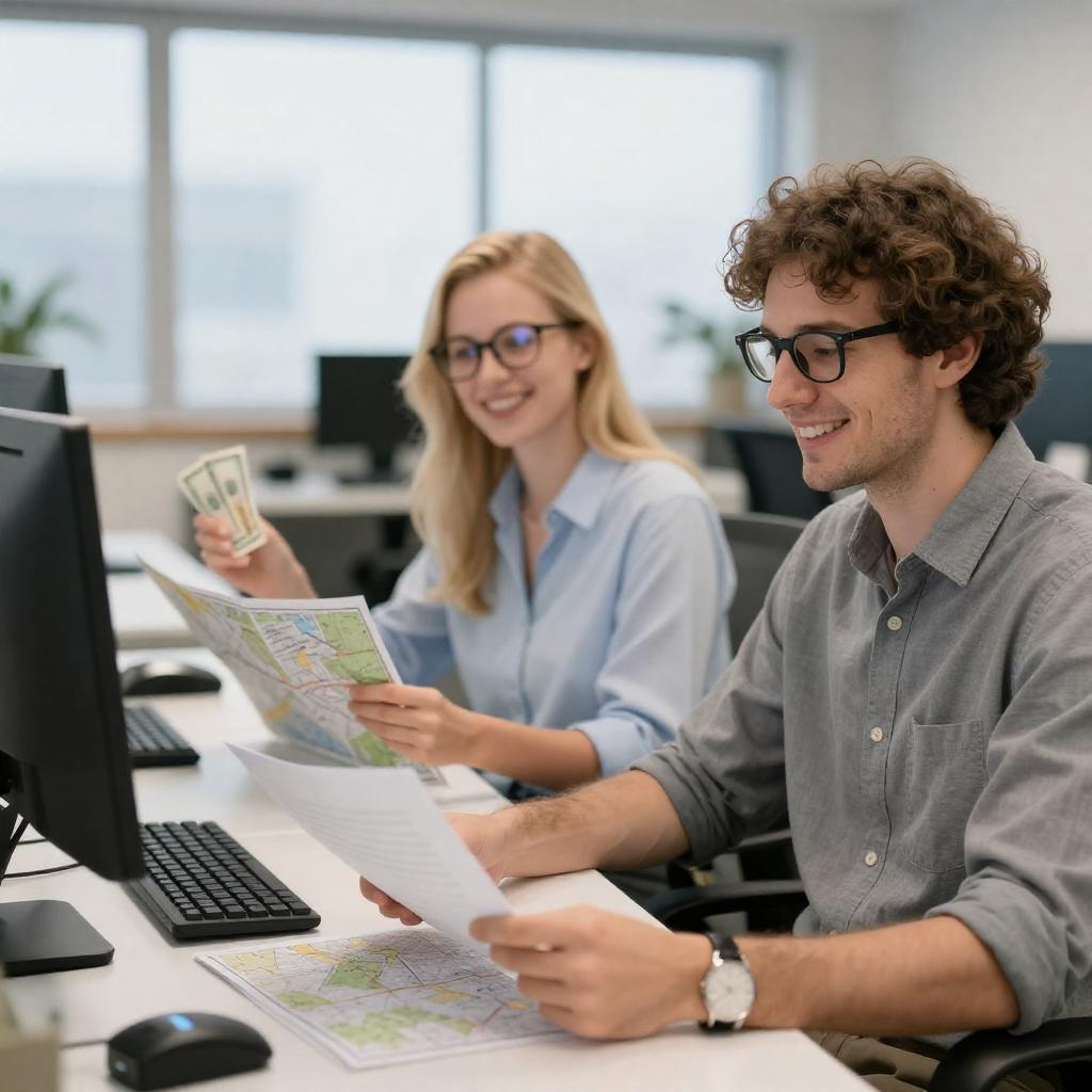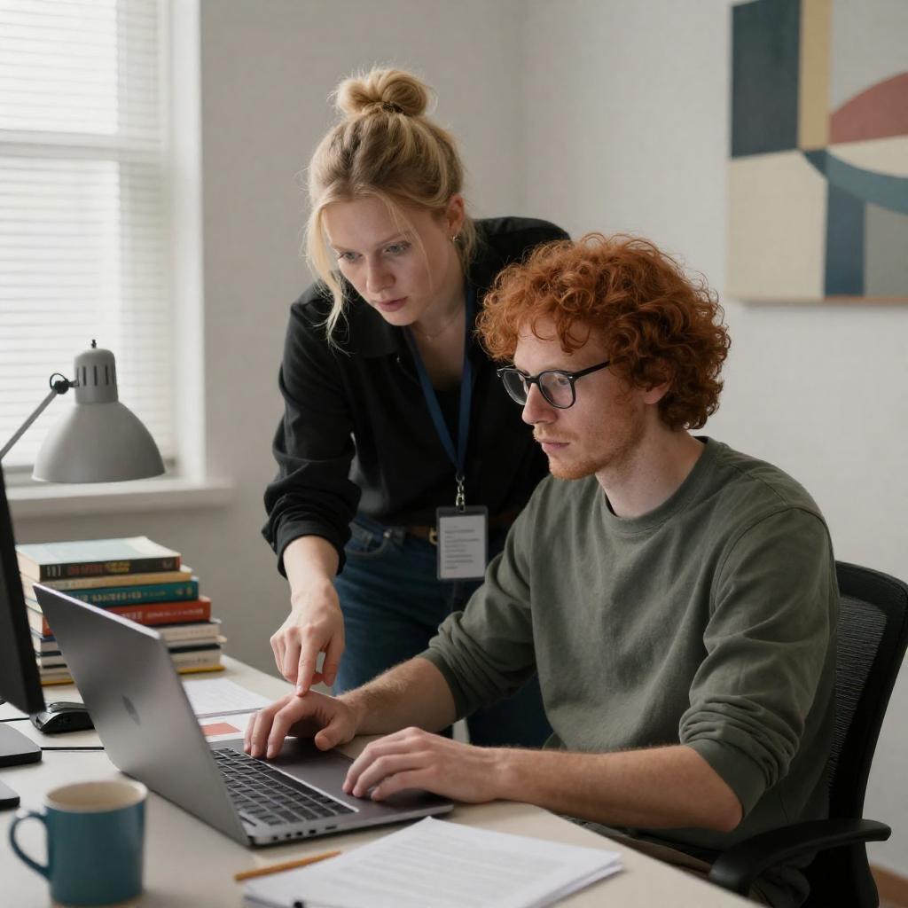 Blonde woman wearing a brown jacket and knit hat smiling and engaging with a curly-haired man in a gray hoodie holding a tablet at a shop counter. Another red-haired man in a black shirt is in the background using a smartphone. The counter features small figurines, a laptop, and colorful objects, with a bright window showing a city view behind them.