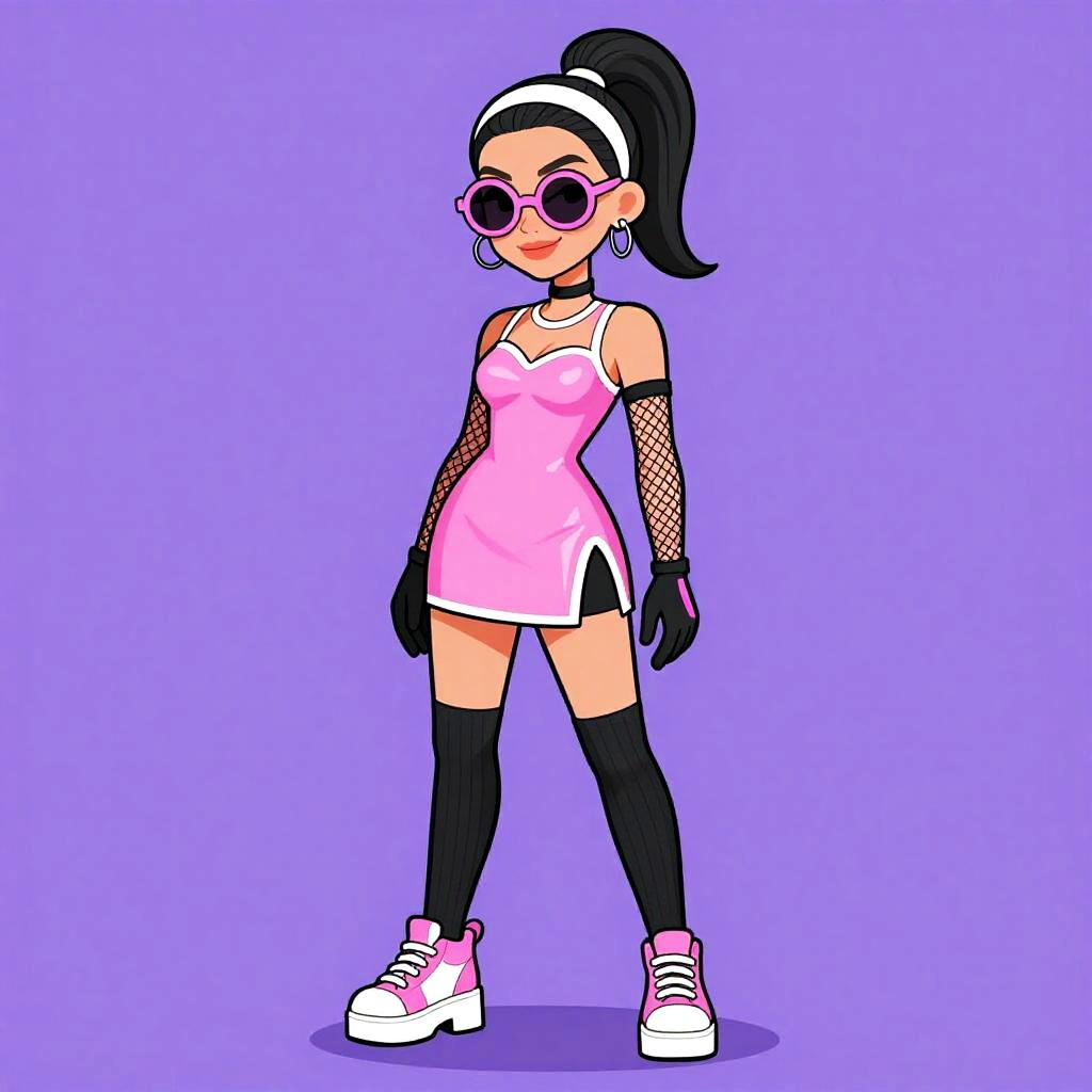 Woman with pretty face and pretty hair. smiling Woman, futuristic pop, clear pink vinyl mini dress with white trim, heart cut-out at bust, black fishnet sleeve on one arm and glove on the other, pink stripe detail, high-waisted black shorts underneath, thigh-high black ribbed socks, platform pink sneakers with white accents, round sunglasses with pink frames, high ponytail, white hairband, studio --sref 1467