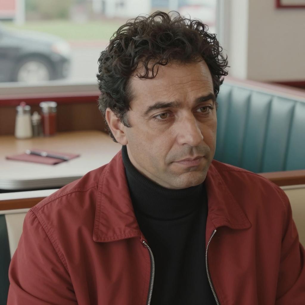 Photograph of a middle-aged man with a serious expression, wearing a dark flat cap and a green checkered vest over a teal shirt. Dim green lighting casts shadows on his face. Background is dark and indistinct.