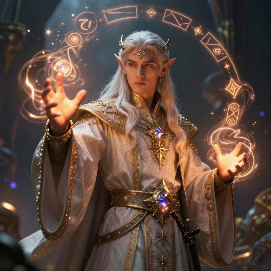 Digital art of an elven mage with long white hair, wearing ornate silver robes, casting glowing magical symbols around himself. Dark, mystical background with
