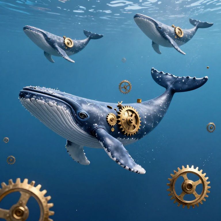 Digital artwork of three blue whales with mechanical gears embedded in their bodies, floating in a deep blue ocean.