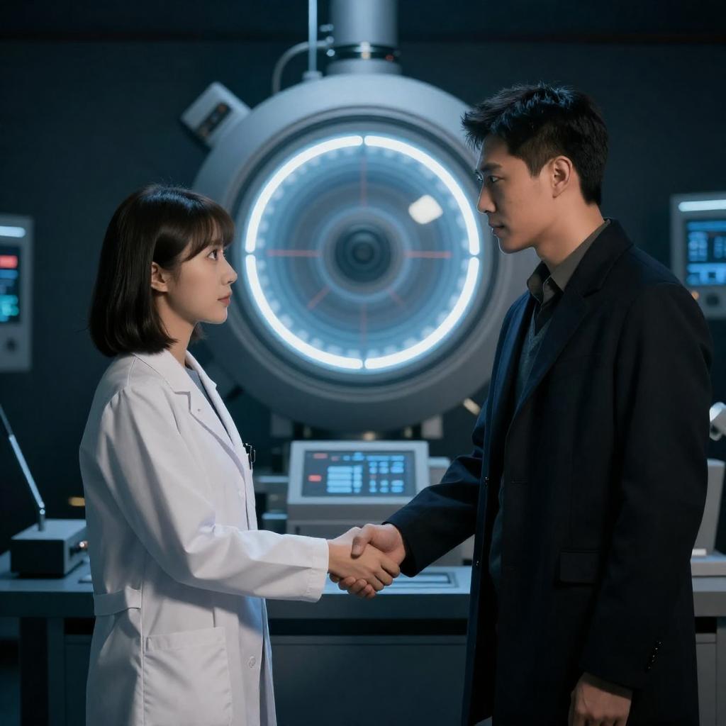 Photograph of a man and woman in a dark room. Man in black coat, woman in white lab coat, both with short hair. They shake hands in front of a large, glowing, circular machine. Blue lighting, intense expressions.