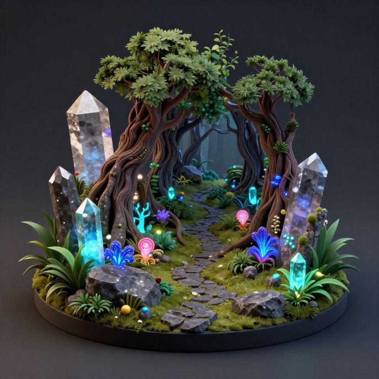3D Printing Enter a world of pure imagination with a fantastical forest scene, quarz rocks, biolumiscent vegetation, Greg Rutkowski, Andreas Rocha,