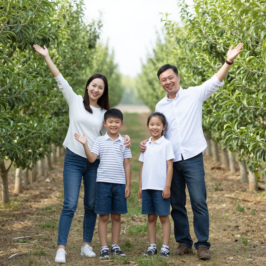 Photograph of smiling Asian family in white clothes standing with arms raised in a fruit tree orchard, bright daylight.