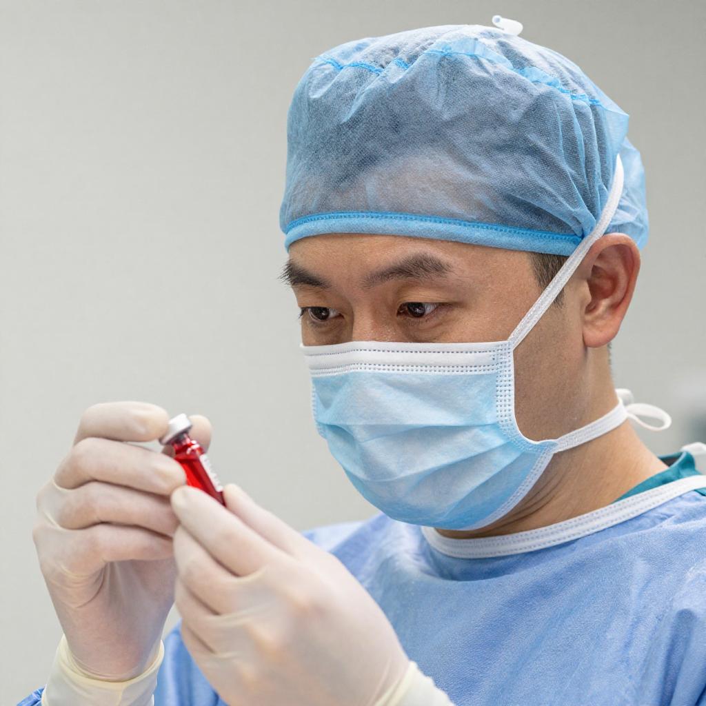 Photograph of a surgeon with light brown skin and dark brown eyes, wearing a blue surgical cap, blue face mask, and white gloves. The camera angle is eye-level, capturing a close-up of the surgeon's right hand holding a small red vial with a white cap. The background is completely white and blurred, with a shallow depth of field. The lighting is even and bright, highlighting the surgeon's focused expression.