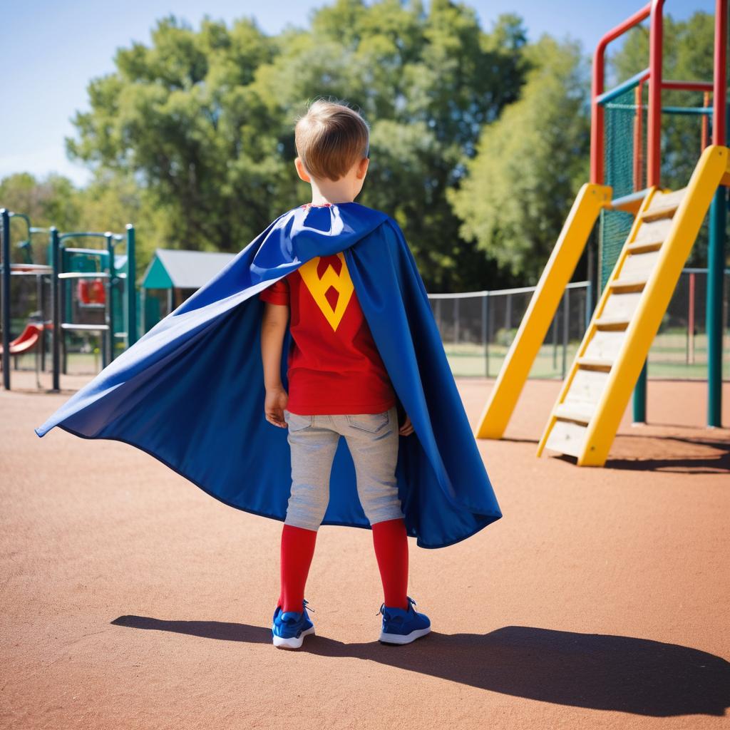 Young boy wearing a blue superhero costume with a red cape, mask, and boots poses confidently in a sunny school playground with slides and climbing structures visible in the background.
