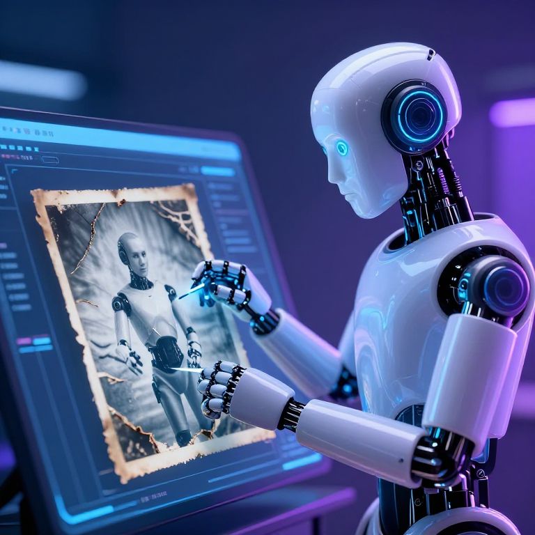 A concept of AI image fixer visualized as a humanoid robot with a translucent shell, applying precise adjustments to an old damaged photograph on a virtual interface, soft ambient lighting with blue and purple tones, emphasizing cutting-edge image restoration technology.