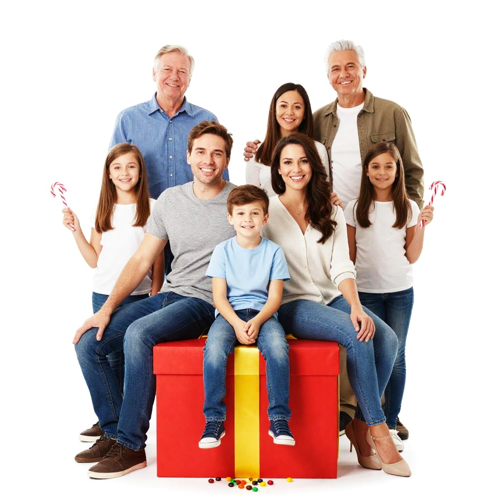 Group photo of six people in festive elf costumes. Three men and three women, wearing red hats, colorful clothes, and elf outfits. Background: arched door with garland and lights. Smiling faces, holding hands, standing together. Red, yellow, blue, pink, green, and striped clothing. One woman in blue cardigan, one child in pink dress with white hat, one man in red jacket with plaid shirt. Elf costumes have pointed hats, some with white fur. Warm, festive atmosphere.