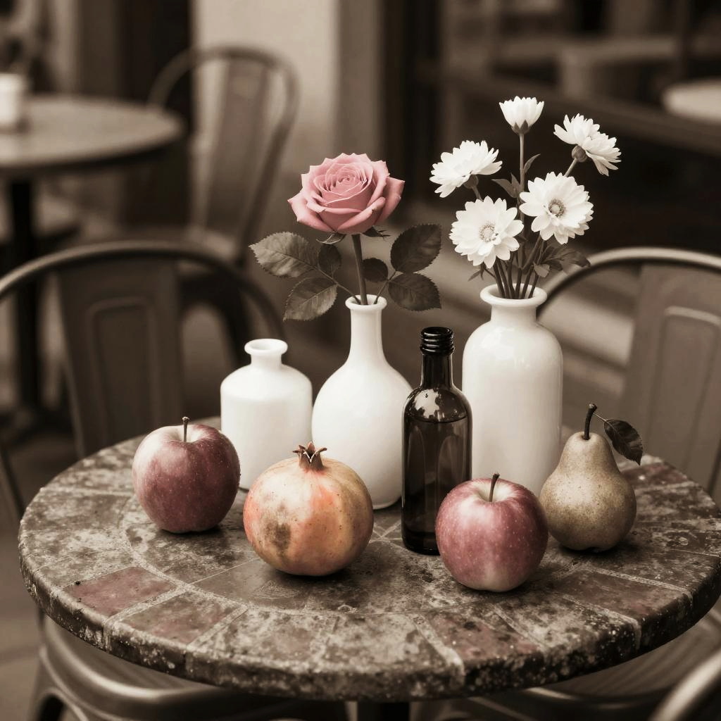 Vintage sepia tone photograph, old brick cafe table with iron chairs, still-life featuring three white vases of varied shapes and a small brown bottle with a dark top; pink roses and white flowers with lively green leaves; fruits arranged around them: a red apple, a yellow-orange pomegranate, another red apple, and a small brown pear with a green leaf; soft overcast light; realistic textures, crisp edges, gentle reflections, soft falloff, color-true, editorial quality