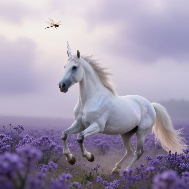 A digital artwork depicts a white unicorn with a flowing mane and tail, galloping through a vibrant field of purple wildflowers under a cloudy, pale purple sky. The unicorn's coat shines with a subtle blue hue, and its horn glows softly. A small dragonfly hovers above its head, adding a sense of magic to the scene. The field stretches into the distance, blending seamlessly with the soft, ethereal background. The unicorn's powerful, graceful movement contrasts with the delicate, blooming flowers, creating a whimsical and enchanting atmosphere.