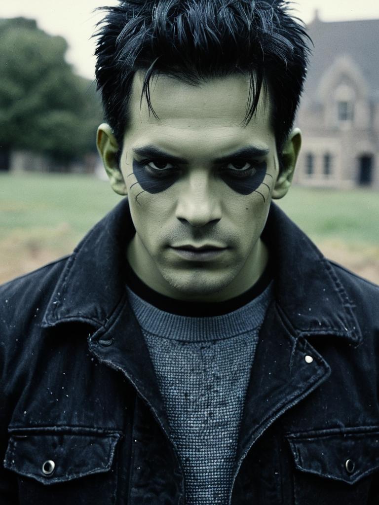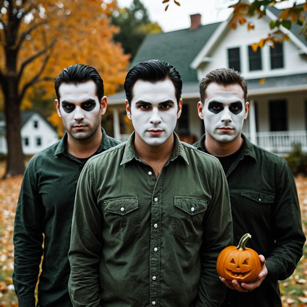 Male trio halloween, photograph of three men with white face paint, Halloween costumes, autumn background, main man in center with dark hair and serious expression, olive green button-up shirt, holding pumpkin, two men behind with similar white face paint, blurry trees and house in background, daytime, realistic style, CGI movie still