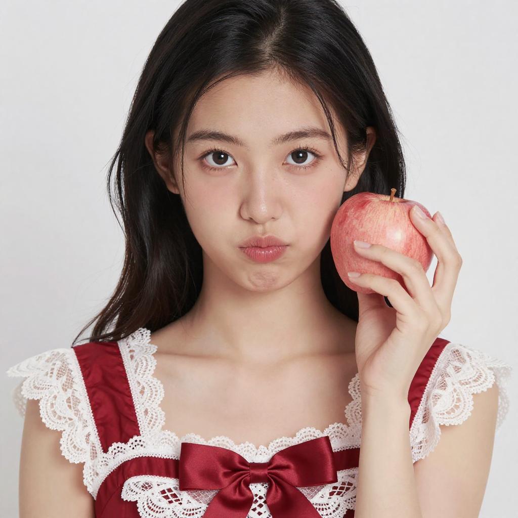 Photograph of an Asian woman with pale skin, black hair, and large red bow, wearing a red and white lace dress with puffed sleeves. She has a shy expression, resting her chin on her hand, with a white background.