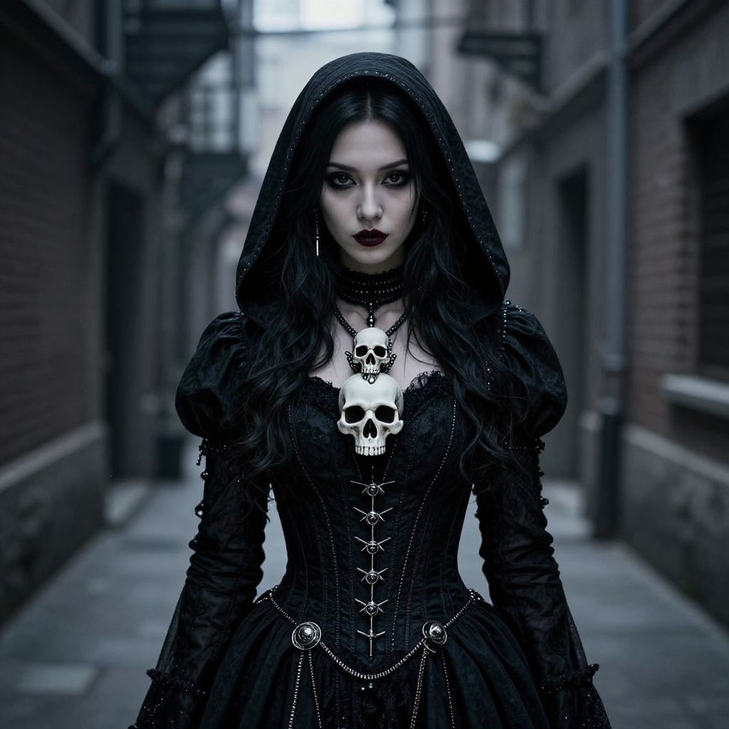 This striking image features a woman dressed in an elaborate gothic outfit, complete with a hood and intricate skull accessories. The dark, atmospheric alleyway in the background adds a haunting quality to the scene, evoking a sense of mystery and intrigue.