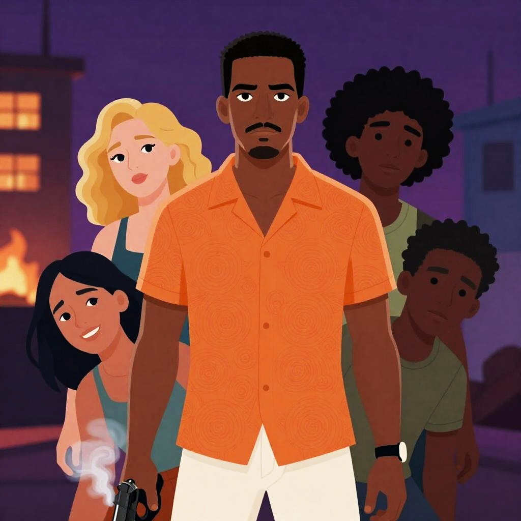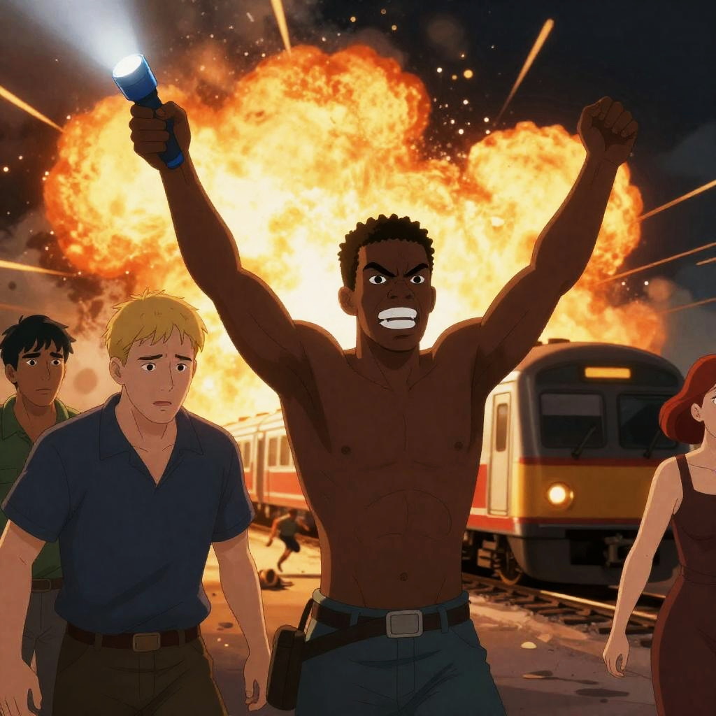 Illustration of a dramatic scene with intense emotions. A shirtless Black man with short black hair, raised arms, and a fierce grin, stands in front of an exploding train. He holds a blue flashlight in his right hand. To his left, a white man with blond hair, wearing a blue shirt, looks down with concern. Another white man with dark hair, in a green shirt, looks to the left with a serious expression. In the background, a woman with red hair and a brown dress stands partially visible. The train is in flames, with bright yellow and orange explosion effects. Multiple small figures near the train's front are running away.