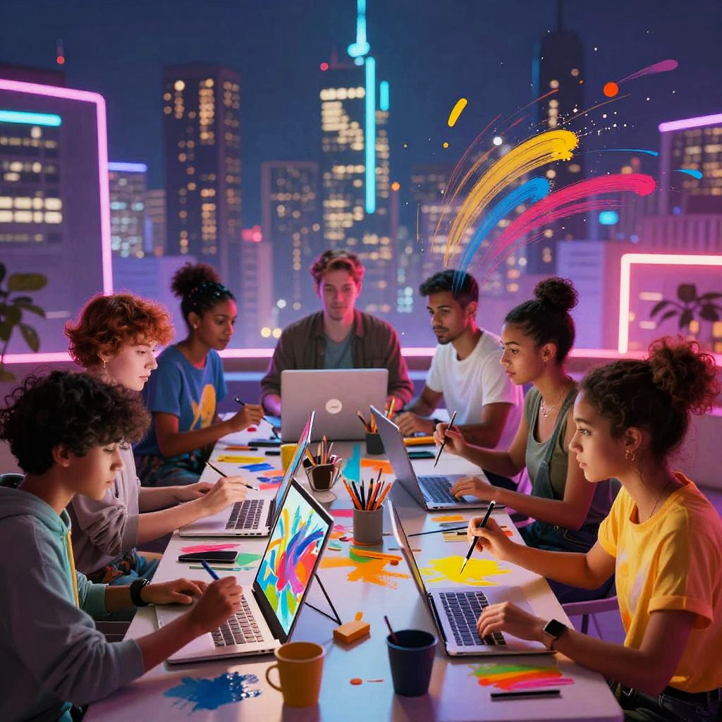 Digital art free online community meetup, vibrant virtual space with avatars painting together, colorful brush strokes swirling around, futuristic city skyline backdrop, neon lights reflecting on surfaces, inclusive creative atmosphere, dynamic and energetic composition