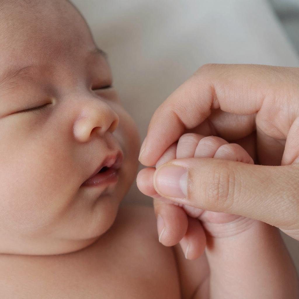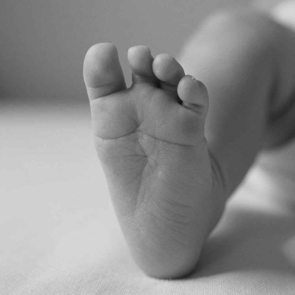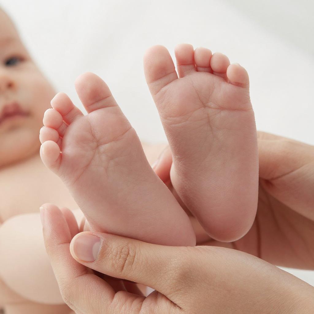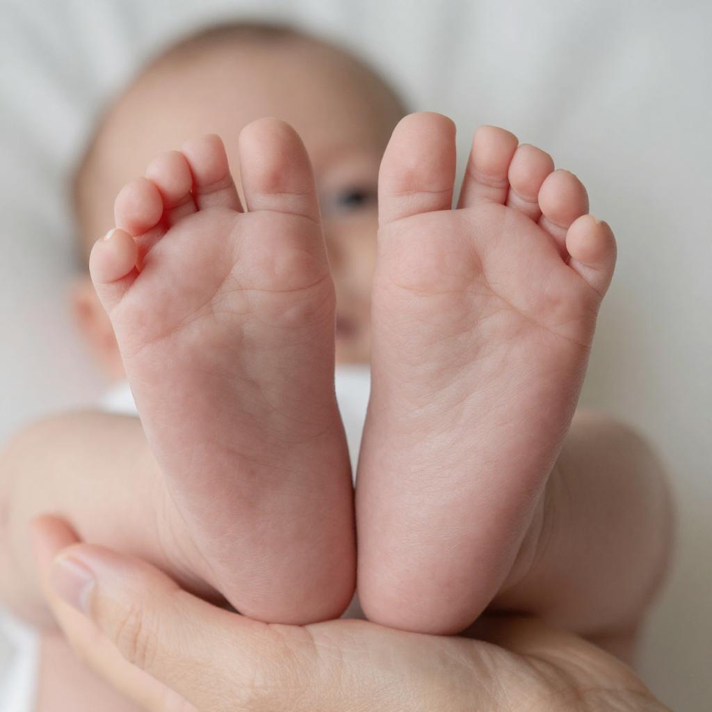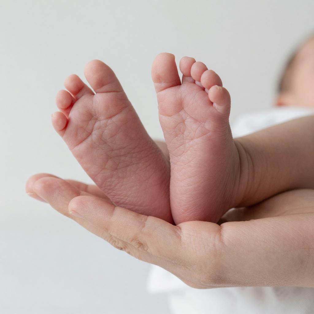 This close-up photograph features a pair of soft, pink baby feet held gently by adult hands. The baby's toes are slightly curled, and the skin appears smooth and delicate. The lighting is natural and even, highlighting the gentle curves and textures of the baby's feet. The camera angle is straight-on, capturing the feet in the center. The background is blurred, creating a shallow depth of field that keeps the focus on the baby's feet and hands. The overall tone is warm and tender.