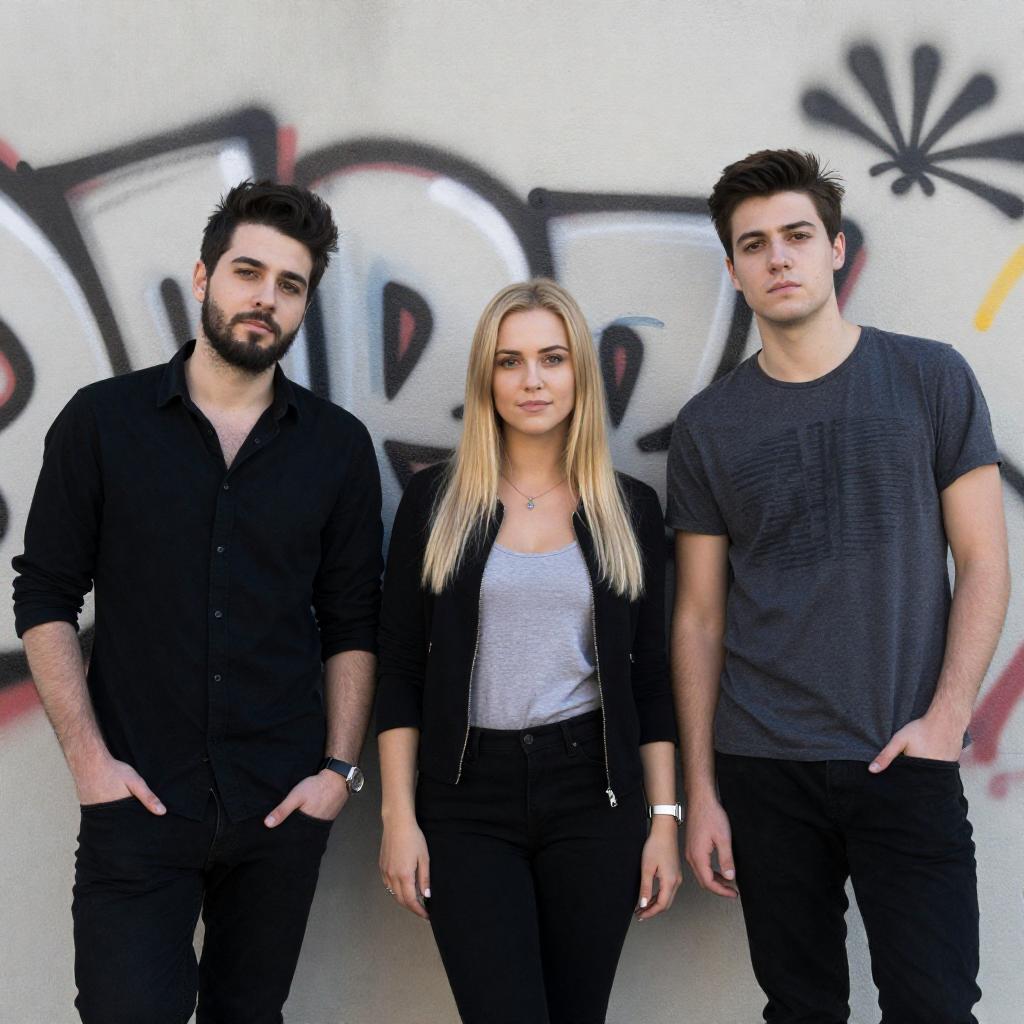 Portrait of three young adults standing against a white wall with graffiti art. On the left, a man with dark hair, beard, and black button-up shirt has his hands in his pockets. In the center, a blonde woman with straight hair, wearing a black jacket over a gray top and black pants stands confidently. On the right, a man with dark hair, a serious expression, and a gray graphic t-shirt stands with one hand in his pocket. The urban background adds a modern, edgy vibe.