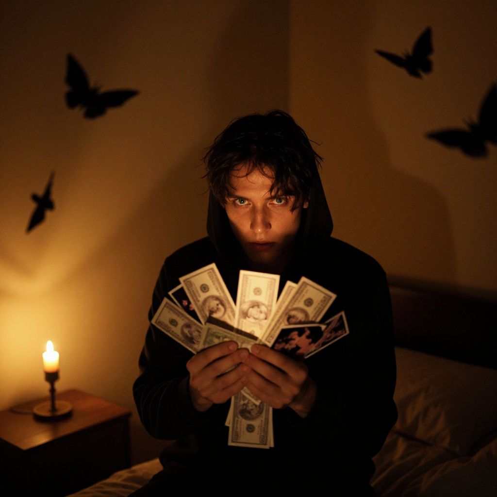 Photograph of a young person with wet, disheveled black hair, wearing a dark hoodie, sitting on a bed in a dimly lit room with warm, orange lighting. They are holding several U.S. dollar bills in both hands, displaying them prominently. A single lit candle on a wooden nightstand is in the background to the left, casting a soft glow. Dark silhouettes of butterflies are on the wall behind them, adding a mysterious atmosphere. The person's intense, focused eyes are illuminated by the candlelight, creating a dramatic and slightly eerie mood.