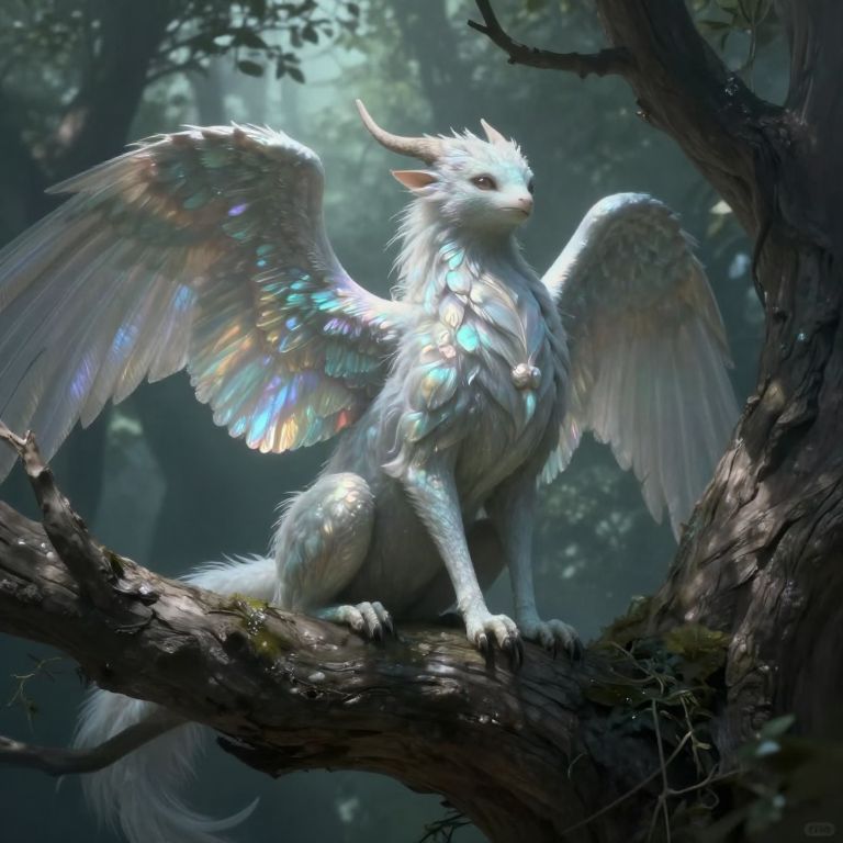 Digital fantasy art of a white, iridescent, winged creature with horns, sitting on a moss-covered tree branch in a mystical forest.