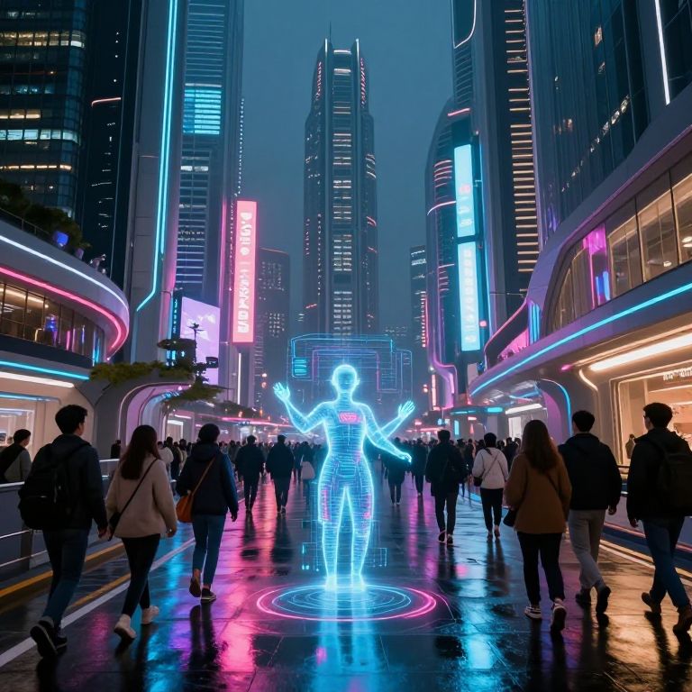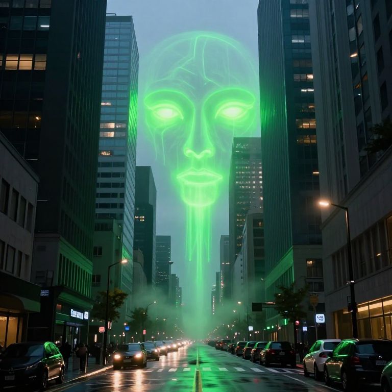 Neon-green bioluminescent mist rises from the wet streets, forming a towering spectral face above a bustling urban landscape, as tall buildings flank both sides of the avenue, their windows glowing faintly like waking eyes at dusk.