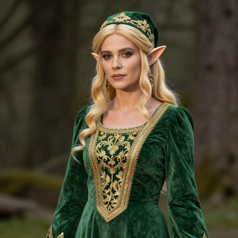 Female elf with blonde hair, wearing a green dress with gold embroidery and a green cap.