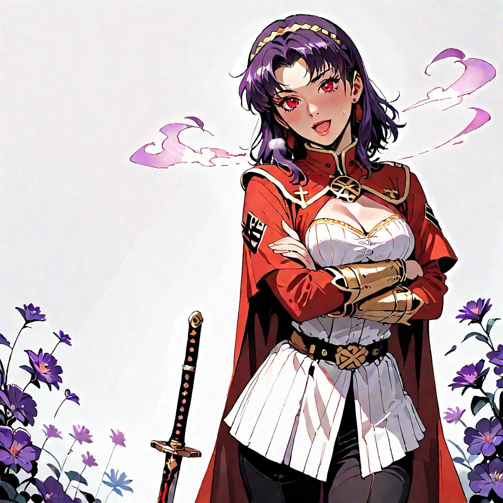 Score_7, score_8_up, score_7_up, source_anime, 1girl, solo, looking at viewer, EPngeKatsuragiMisato, purple hair, armor, black pants, blouse, bracer, braid, breastplate, breasts, breath, brooch, cape, cleavage, cowboy shot, crossed arms, crown, crown braid, fang, glowing, glowing eyes, jewelry, medium breasts, medium hair, open mouth, pants, red eyes, red shirt, scabbard, sheath, sheathed, shirt, sleeves past wrists, slit pupils, standing, sword, vampire