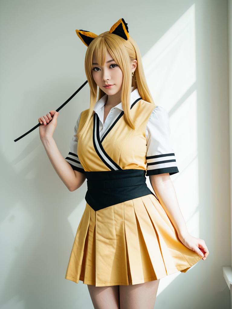 Sexy cosplay woman character wearing Mami Futami costume. Realistic photo. Jane Doe dressed as Mami Futami --sref 1399