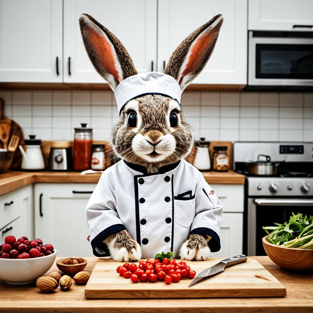 A cartoon rabbit dressed in a white chef's jacket with red trim stands behind a kitchen counter. The scene shows a wooden cutting board with a seafood dish garnished with nuts and berries. The background features a modern kitchen with wooden cabinets and stainless steel appliances. The rabbit has a mischievous expression, adding a whimsical and fun vibe to the culinary setting.