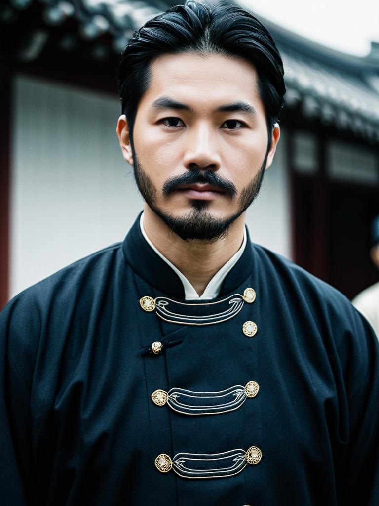 National costume usa male, male focus, 1boy, solo, facial hair, black hair, mustache, looking at viewer, blurry background, blurry, chinese clothes, upper body, black eyes, beard, long sleeves, straight-on, korean clothes