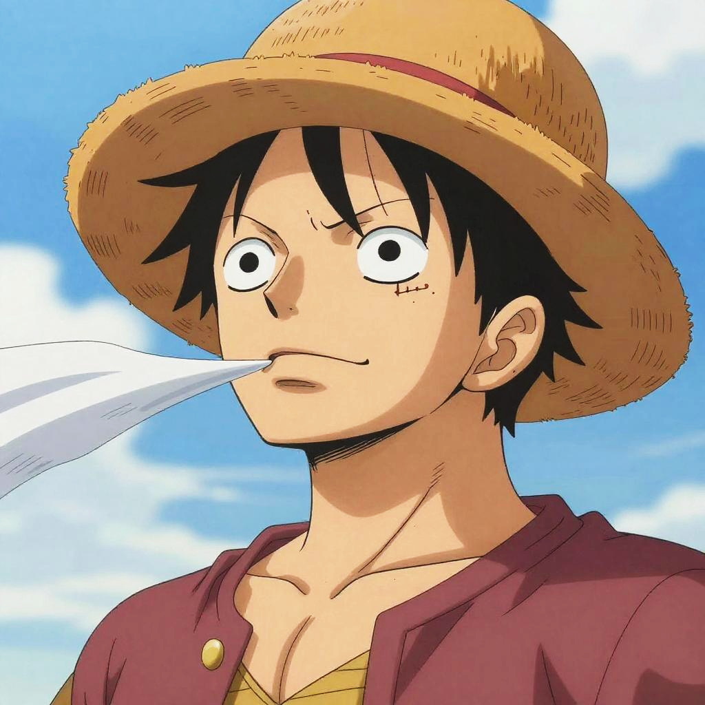 Luffy ai art, stylized anime composition focused on a brave pirate leader wearing a wide-brimmed straw hat, evocative expression, blowing wind highlighted by dynamic fabric movements, detailed character design with soft shading.