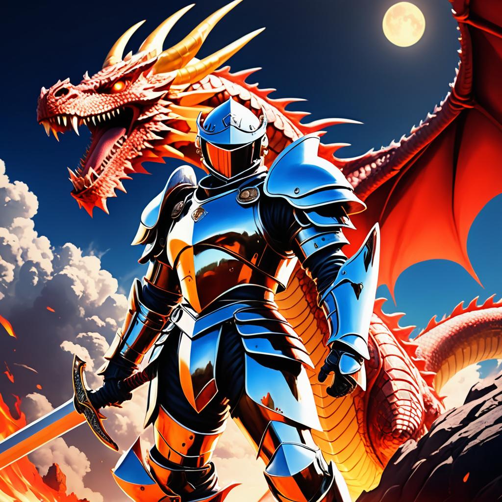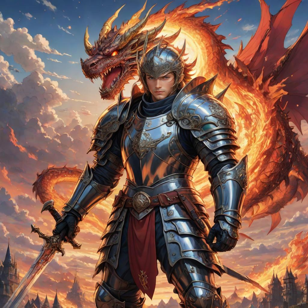 Anime Knight with Shining Sword and Fiery Dragon