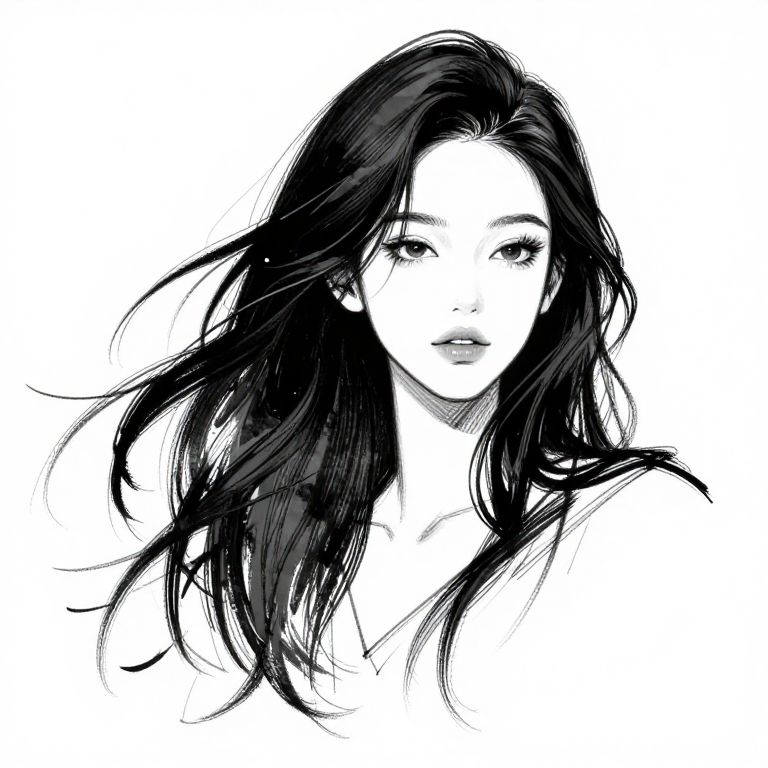 Hair style sketch, stylized ink drawing featuring long flowing locks with wind-blown effect, rich black and white contrast, expressive brush strokes and dynamic lines, contemporary minimalist portrait focus, artistic and creative hair design