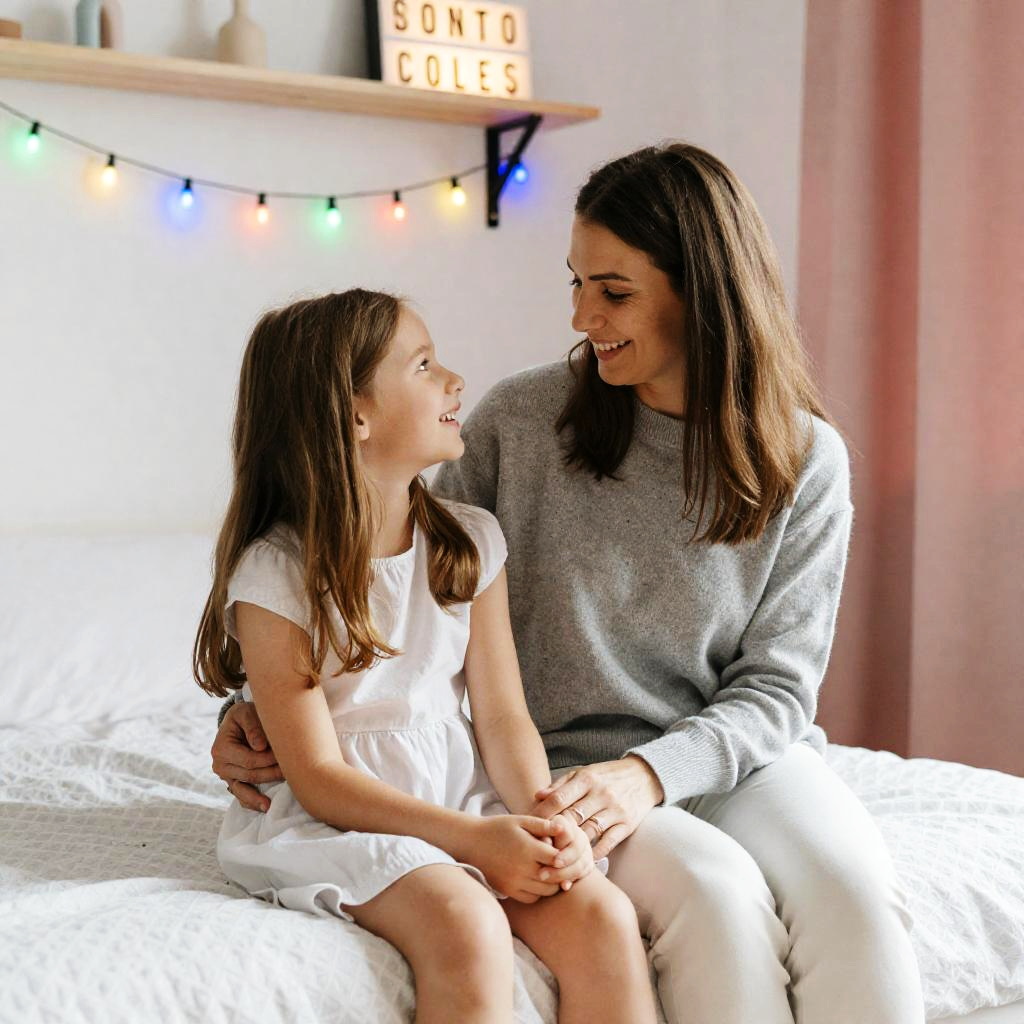 Photograph of a mother and daughter sitting on a bed. Mother with long brown hair in a gray sweater, daughter with light brown hair in a white dress, both looking at each other smiling. Bed with white patterned blanket, colorful string lights on wall, wooden shelf with illuminated sign, pink curtain on the right. Daughter's hands clasped, mother's hand on daughter's knee. Soft lighting.